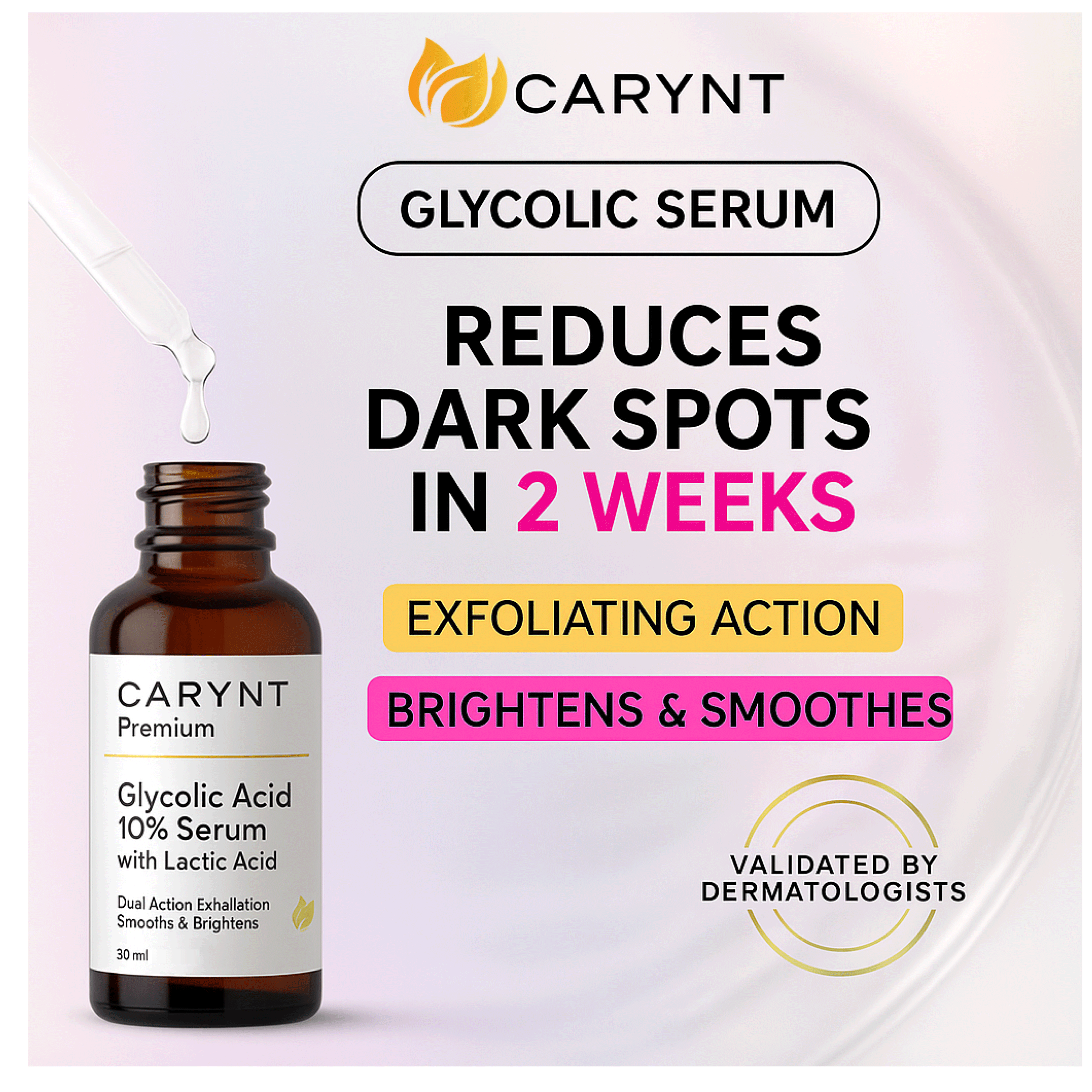 Carynt's 10% Glycolic & Lactic Acid Serum gently exfoliates to fade dark spots, brighten dull skin, and refine texture. Perfect for oily, dull, or uneven skin.